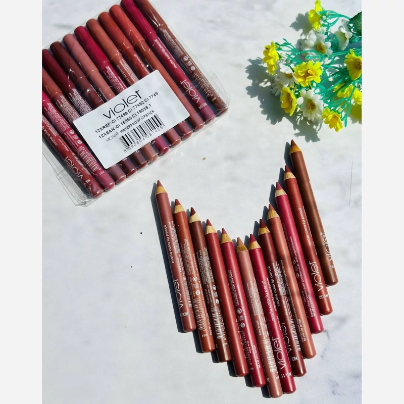 رژ لب مدادی ویولت violet در 12 رنگ متنوع که بسیار زیبا هستند بیگمنت خیلی خوبی دارند ماندگاری 24 ساعته که ظاهری مات روی لب ایجاد میکند رنگ های ان شامل تناژ های کاربردی و زیبا شامل قرمز، گلبهی، کرم قهوه ای، صورتی و … در این ست و همچنین قابلیت ترکیب رنگبندی دارندرژ مدادی از لوازم آرایش کاربردی و ثابت کیف آرایش هر خانمی است که به زیبایی خود اهمیت می دهد. این رژلب مدادی ستی 12 عددی از رژ های با کیفیت و با تنوع رنگی بالا ارائه کرده است که می توان از آن ها برای ست کردن با انواع آرایش ها استفاده کرد و حتی رنگ هایش را با هم ترکیب کرد.