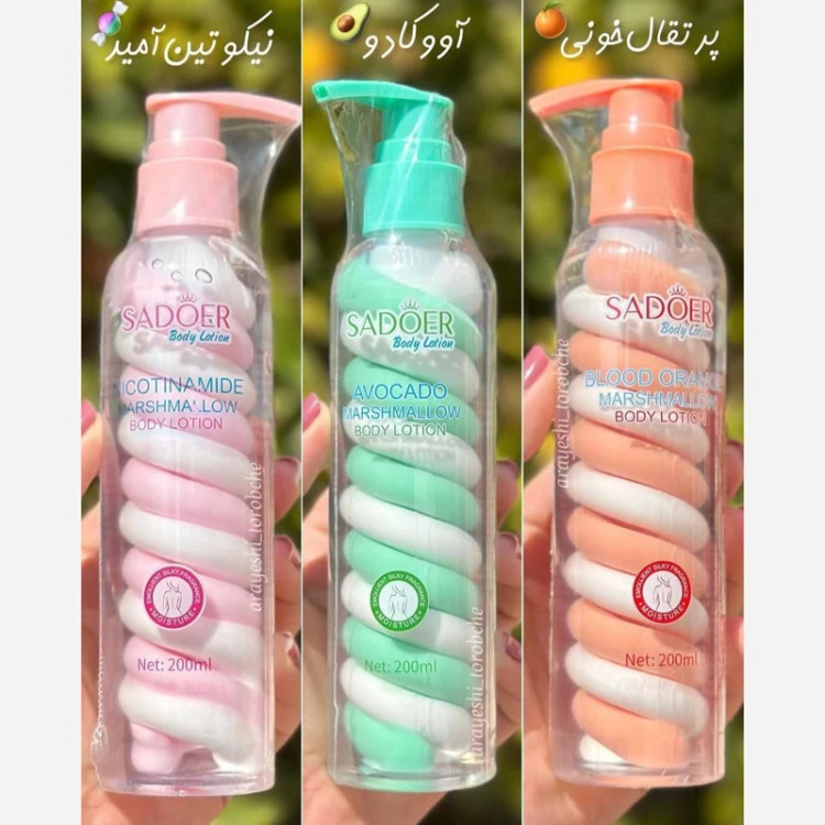 لوسیون بدن مارشمالو سادور🍡🍧🍰🌸🫧 🍭اصلی 🦥🙂↔️ همه دنبال اینننننن🩵🎀 لوسیون مارشمالوی کیوت و خوشمزه🍬🥹🍓🍧✨🤌🏻 یه بوی بشدت دخترونه و ناز داره🌸🫧 که میتونی با یه قیمت خیلی خفن داشته باشیش💖🌠🤌🏻 بدنتون و رطوبت رسانی میکنه و بعد ازحموم وقتی میزنید ، کلی پوستتون نرم میشه☁️🫧🪄 حاوی ویتامین نیاسینامید و B3🤍🪿 غنی شده از رز صورتی، پودرمروارید و آلوئه وراست🫢🫧🌷🐚🌱✨ برطرف کننده خشکی و تیرگی های پوستته🍓🫧 خیلی سریع جذب میشه و پوستتون رو چرب نمیکنه🫠🌸✨🩷 رایحه ی بشدت قشنگی داره🥰🌷💫 بافتشم بشدت سبک و لطیفه☁️🪷 • 200 mil